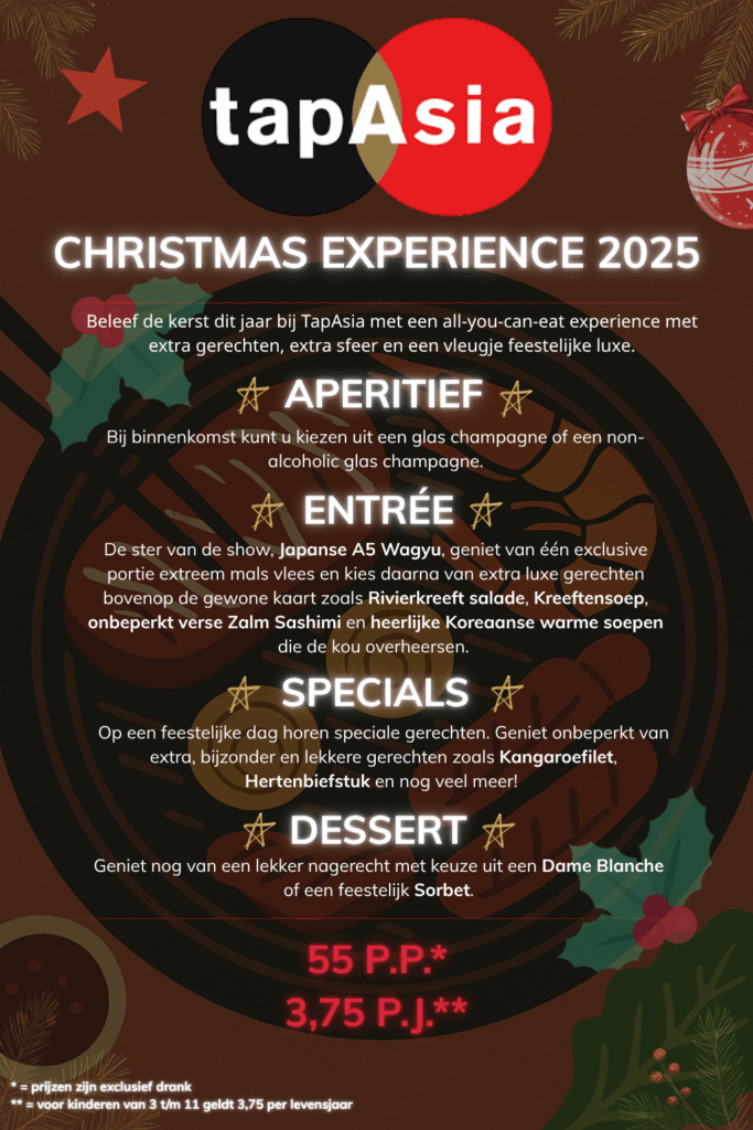 De kerstperiode staat voor de deur, en wij nodigen u van harte uit voor een onvergetelijke feestavond vol smaak en gezelligheid bij KBBQ by TapAsia. Kom genieten van onze sfeervolle en warme ambiance, perfect voor een kerstfeest met vrienden en familie.